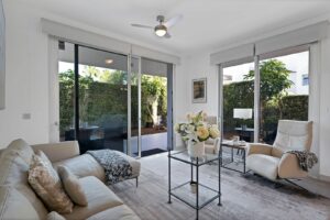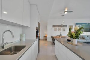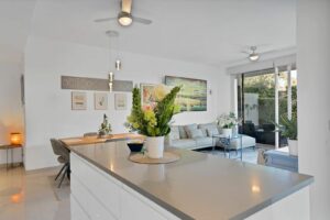 The open-plan kitchen is a standout feature, showcasing a bespoke central island with quartz counter-tops and fully integrated, top-of-the-range appliances—perfect for both everyday living and entertaining. Every detail has been carefully considered, from the advanced air conditioning, heating, and air purification system to ceiling fans installed in all rooms, ensuring comfort in every season.