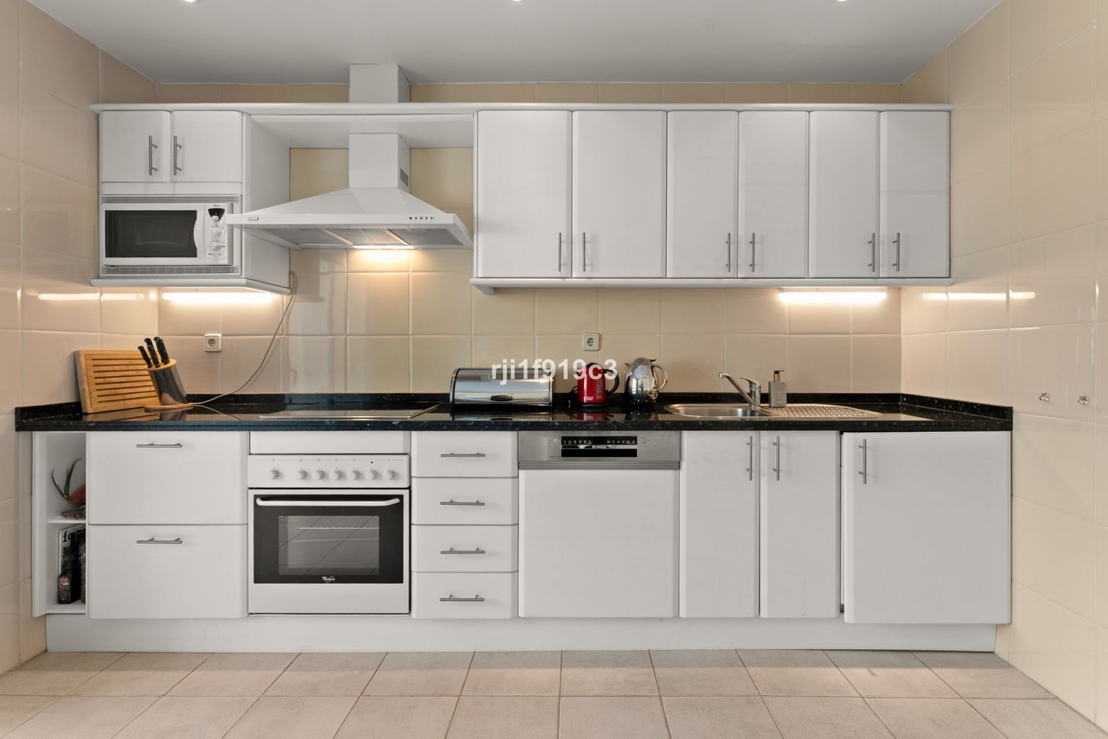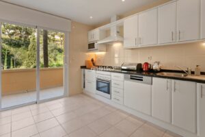 The fully furnished kitchen includes a practical adjacent terrace with garden and pool views.