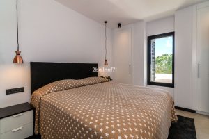 It offers three bedrooms: two spacious master bedrooms with en-suite bathrooms featuring ceiling rainfall showers, heated mirrors, and modern lighting, as well as a third smaller bedroom and a guest toilet.