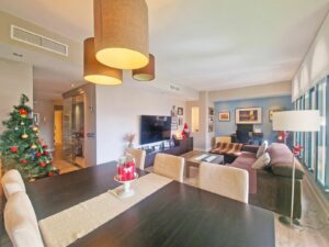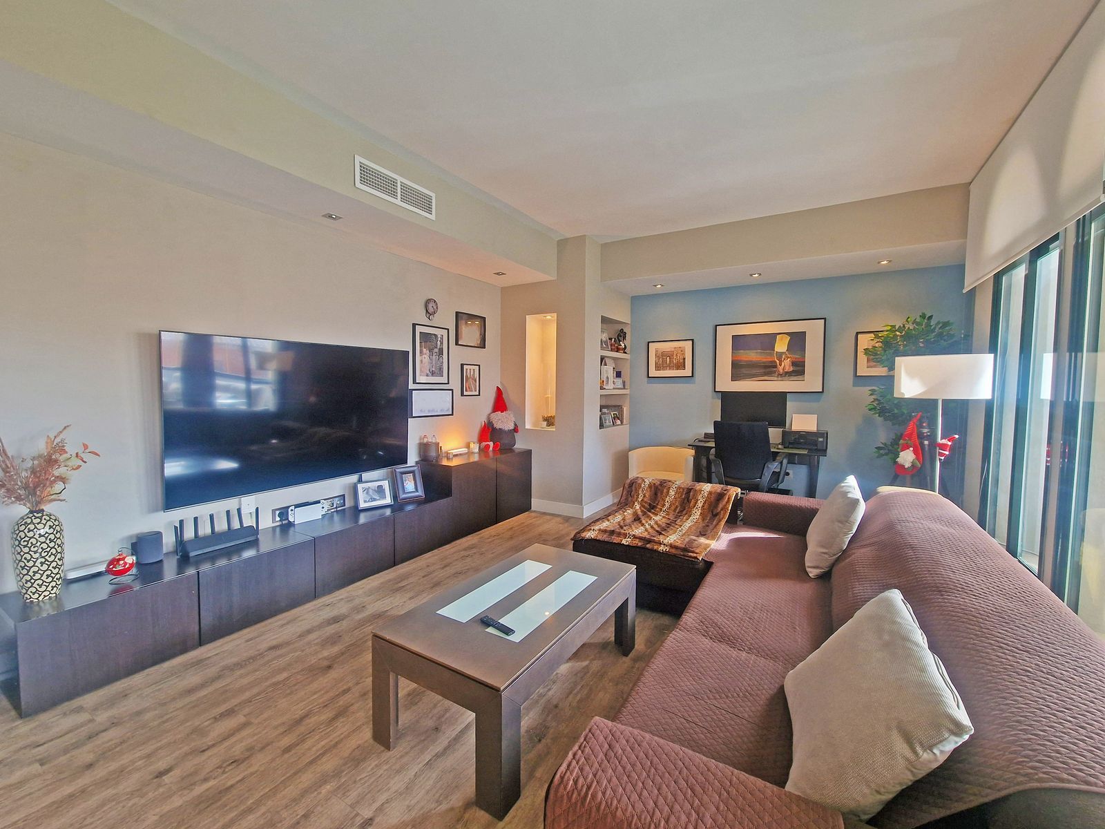 The apartment comprises three spacious bedrooms and two modern bathrooms. The master bedroom benefits from an en-suite bathroom and a walk-in dressing area, providing both privacy and comfort. The bright and generous living-dining area opens onto a large south-facing glazed terrace, which can be enjoyed throughout the year and is particularly appealing during the winter months.