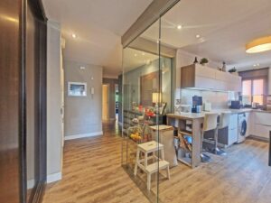 The contemporary semi-open kitchen has been fully renovated and features a glass partition that allows natural light to flow into the welcoming entrance hall, which also offers a large built-in wardrobe for added convenience.