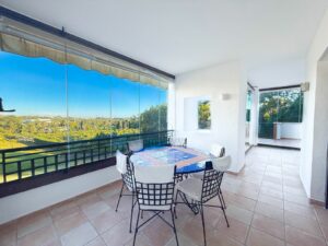 The property features a spacious terrace facing the morning sun, offering open views of the sea, the swimming pool, and the surrounding tropical gardens. Part of the terrace is fitted with removable glass panels, allowing you to enjoy the space open in summer or enclosed during winter—perfect for year-round use.