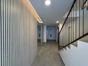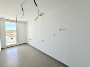 The apartment features three generously sized bedrooms, including one with an en-suite bathroom, complemented by an additional bathroom and two toilets. The living spaces are thoughtfully designed, comprising a bright and airy living room, a dining area, and a fully fitted, equipped kitchen with a utility room. High-quality finishes and modern conveniences such as air conditioning, central heating, and a ceiling cooling system ensure year-round comfort. The property also benefits from advanced aerothermic technology and solar panels, reflecting a commitment to energy efficiency.