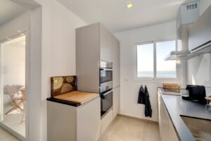 The apartment features a bright open-plan living area with floor-to-ceiling windows that frame the stunning sea views and flood the space with natural light. The modern kitchen blends seamlessly into the living area, creating a perfect environment for both everyday comfort and elegant entertaining.