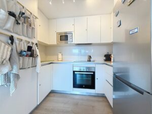 The interior has been designed in a modern Mediterranean style with high-quality materials. The open-plan kitchen, fully equipped (refrigerator, oven, ceramic hob, etc.), opens onto a welcoming living area that extends seamlessly to the outside.