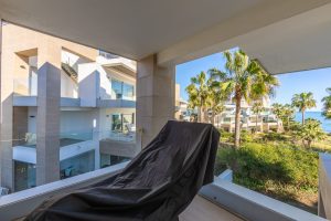 Modern-style apartment located on the beachfront, offering stunning sea views from which to enjoy spectacular sunrises, situated in the magnificent Horizon Beach development and built by the prestigious developer Taylor Wimpey, renowned for its contemporary design and high-quality finishes. The impeccably maintained community provides direct beach access, lush Mediterranean gardens, and an elegant heated outdoor pool for year-round enjoyment, along with refined communal areas designed for relaxation, featuring comfortable loungers and a spacious covered terrace in a privileged setting. Just a 5-minute drive from the center of Estepona and Puerto de la Duquesa, with all services close at hand, it includes a convenient underground parking space and a large storage room located right in front of the parking, making it an excellent beachfront opportunity that must be seen.