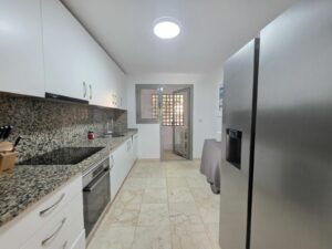 It offers three bedrooms and three bathrooms, including a master suite with direct access to the terrace, ensuring both privacy and comfort for residents and guests. The fully fitted kitchen also includes a separate laundry area.