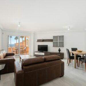 The apartment is distributed into 3 bedrooms, 2 bathrooms (one en-suite), an independent fully fitted kitchen and a spacious living-dining room with direct access to a large terrace boasting panoramic sea views.