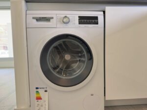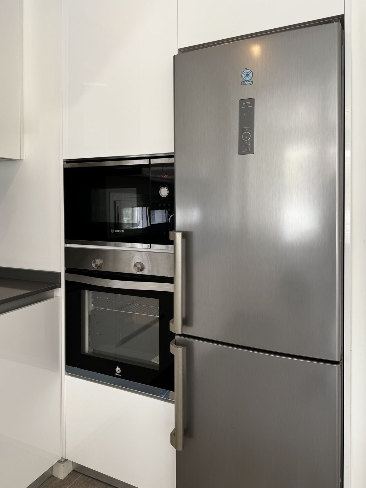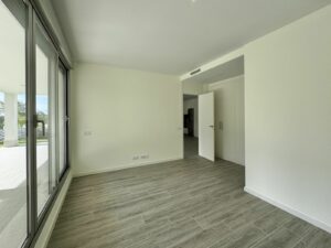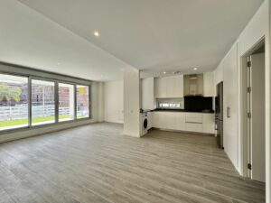 The apartment offers a spacious living-dining area with access to a covered terrace and garden, an open-plan kitchen fully equipped with Bosch appliances, three bedrooms with built-in wardrobes, and two bathrooms finished to high standards. The master bedroom also opens directly onto the garden, while the other two bedrooms enjoy views of green areas.