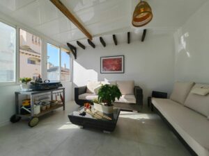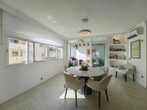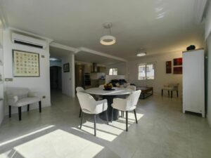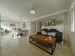 The apartment welcomes you with an elegant central lobby. To the right, a spacious open-plan kitchen, dining, and lounge area unfolds, seamlessly connecting to a covered terrace with a fully furnished lounge — ideal for enjoying sunny mornings and the cooler shade of the afternoons thanks to its southeast orientation.