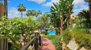 The master bedroom includes a cozy walk-in closet, and from both the bedroom and the living room you can access a spacious terrace offering unbeatable views of the stunning gardens and pool. The property also includes a private outdoor parking space within the community.