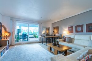 Set in a secure gated community between Puerto Banús and Estepona town, this spacious three-bedroom apartment offers the perfect blend of comfort, style, and coastal convenience. The apartment features a generous open-plan living space that connects effortlessly to three private terraces, ideal for relaxing or entertaining with views over the beautifully maintained gardens and the communal pool. The brand-new fully fitted kitchen comes with a separate utility room — stylish and practical in equal measure. The property includes two underground parking spaces and a private storage room, and is just steps from the brand-new paddle club and a 10-minute walk to the beach — ideal for an active, outdoor lifestyle. Inside, the apartment is finished to a high standard with marble floors, hot and cold air conditioning, fitted wardrobes, and fast fiber-optic internet. The gated community also offers excellent shared facilities including a gym and sauna, adding to its year-round appeal. Surrounded by golf courses, close to international schools, and with easy access to transport links, this home delivers both tranquillity and convenience. With beautiful sea and mountain views, and in immaculate condition throughout, this is a smart choice whether you’re looking for a permanent home or a stylish lock-up-and-leave retreat on the Costa del Sol.