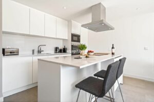 The apartment offers three bedrooms, including a master bedroom with en-suite bathroom, a second full bathroom, a bright living-dining area with open-plan modern kitchen, an entrance hall, internal hallway, and a separate utility and laundry room.