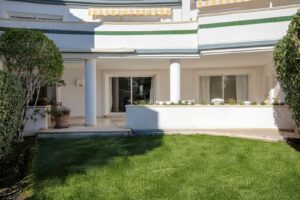 The apartment offers over 220 sqm of interior living space arranged across two levels, a size that has become increasingly uncommon in beachfront developments, making it an ideal canvas for a comprehensive renovation project aimed at enhancing value, functionality and design. Its south-facing orientation ensures abundant natural light throughout the day, while the interior flows seamlessly onto a spacious terrace and private-use garden, creating a natural connection between indoor and outdoor living areas.
