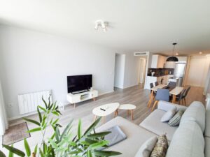 The apartment is furnished with high-quality minimalist furniture, in soft colors that evoke elegance and calm.