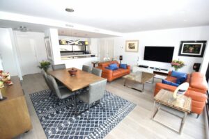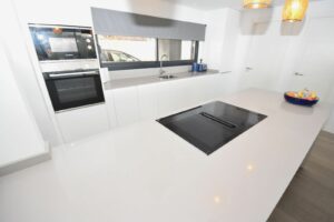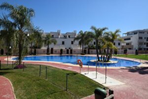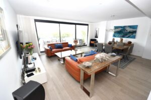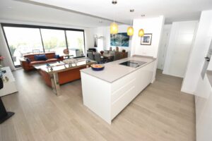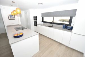 Fantastic, recently built apartment which is perfect for families who want to live in a spacious and comfortable home. It consists of a generous living-dining room, fully fitted open plan kitchen, equipped with Bosch electrical appliances, 3 bedrooms, 2 bathrooms, guest toilet and a utility room. The lounge and kitchen blend together seamlessly and with windows in the kitchen and floor to ceiling patio doors in the lounge this beautiful living space is flooded with natural light and fresh air. The master bedroom has an en-suite bathroom and walk-in closet. Bedrooms 2 and 3 also have built-in wardrobes and they share a shower room. Like the lounge, all bedrooms have direct access to the very spacious 55m2 terrace where you can enjoy stunning sunrises and views of La Noria Golf course and the surrounding area. The terrace from the lounge has glass curtains creating an extra room for use in the winter. In the summer you open the curtains to enjoy the full terrace space, the perfect solution for year round use. Air conditioning hot and cold, video intercom, under floor heating in lounge/dining room, kitchen and all bedrooms which together with the A/C and hot water are powered by an aero-thermal system. A secure underground parking space and private storage room are included in the price and there is a lift and stairs from the garage to all levels. With only two apartments on each floor this property has no neighbours on either sides and is therefore very private. Located in a gated community, with a large circular swimming pool for adults and a separately gated large children's swimming pool with night-time illumination, two paddle-tennis courts, children’s playground and landscaped garden this is a quality residential community perfect for permanent living or amazing family holidays. Within 10 minutes walk of La Cala Beach this is the perfect apartment for family holidays all summer. The owners added many extras to this apartment including, top of the range kitchen worktops, extractor built into the hob, shutters (persianas) added to kitchen and WC windows, glass screen on corner of terrace and sun shade (toldo) above the main seating area of the the terrace.
