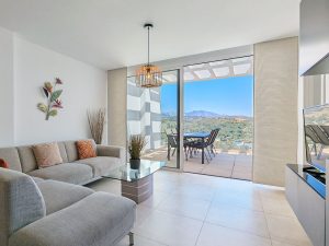 Apartment for sale in , Mijas Costa with 3 bedrooms, 2 bathrooms, 1 on suite bathroom and with orientation south/east, with communal swimming pool, private garage (1 parking spaces) and communal garden. Regarding property dimensions, it has 112.15 m² built, 97.43 m² interior and 21.61 m² terrace. Has the following facilities transport near, air conditioning, fully fitted kitchen, jacuzzi, sauna, guest room, storage room, gym, solarium, double glazing, video entrance, security service 24h, guest toilet, private terrace, kitchen equipped, living room, sea view, mountain view, golf view, indoor pool, heated pool, automatic irrigation system, security shutters, internet – wi-fi, covered terrace, 24h service, electric blinds, fitted wardrobes, gated community, lift, panoramic view, tennis / paddle court, doorman, underfloor heating (bathrooms), close to children playground, close to sea / beach, close to golf, uncovered terrace, glass doors, open plan kitchen, balcony, optional furniture, spa, wheelchair-accessible, excellent condition, close to shops, close to town, close to schools and pets allowed.