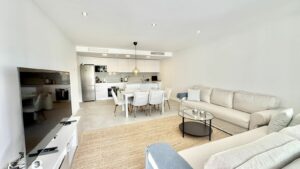 The interior offers a bright living room with an open kitchen, 3 bedrooms, 2 bathrooms, and a separate laundry room, as well as underfloor heating in the bathrooms and central air conditioning.