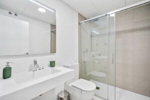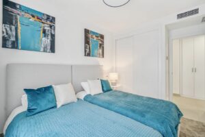The master suite offers a sanctuary of comfort with a separate wardrobe area and a lavish ensuite bathroom featuring a walk-in shower, while the guest bedroom boasts fitted wardrobes and its own ensuite shower room. This remarkable residence, nestled within a secure gated complex, 2 private parking space included, provides access to a wealth of communal amenities, including a spa with an indoor heated pool, an infinity pool, a gymnasium, and an indoor golf simulator, ensuring a lifestyle of unparalleled convenience and indulgence.
