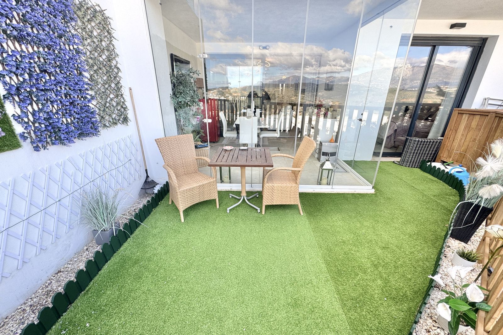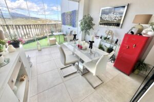 This modern luxury apartment offers; spacious lounge/ dining area with large open plan modern white high-gloss fitted kitchen. With fitted oven, hob, hood, fridge freezer, microwave. 3 large double bedrooms with fitted wardrobes, Master with patio doors to terrace, walk in wardrobe & luxury en-suite shower room. Plus a 2nd family shower room. Covered terrace (now with glass curtains) and private use garden offering views over development with mountain backdrop and partial sea views. Hot & cold air-con, private parking space and storage room. Interiors have a beautiful timeless design, with high quality finishes and feature neutral colour palettes.