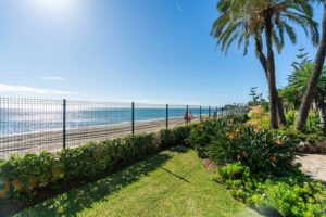 This is a fabulous 3 bedroom apartment in the front line beach complex of Las Mimosas in La Cala de Mijas. Set on the first floor with views over the beautiful gardens, pools and Mediterranean, this is the perfect spot for enjoying the beach life all year round. The apartment comprises an open plan kitchen which has been recently refurbished, large lounge with access to the terrace, master bedroom with en-suite, two further bedrooms and one bathroom. Access is on the street level or go down one level via stairs or lifts to the gardens and pool with direct access out to the boardwalk and the beach. Properties don't come up for sale often in this highly sought after complex so early viewing is highly recommended.