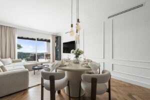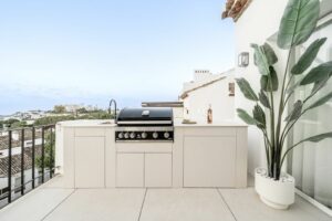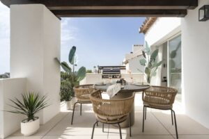 The apartment features an open plan kitchen with Smeg appliances and a living room with large sliding doors to the terrace boasting panoramic views to the surrounding landscape, La Quinta Golf and the Mediterranean beyond.