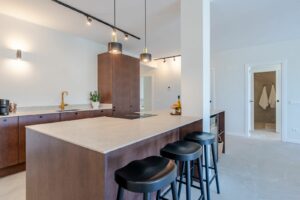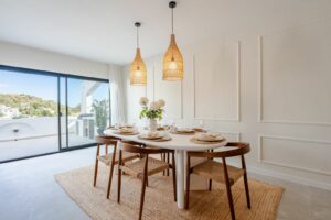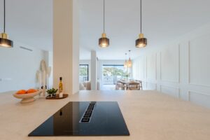 Mirador 5 offers modern design, generous space, and breathtaking views. The open-plan living area combines a bright lounge, dining space, and a fully equipped oak-panelled kitchen with a central island, leading onto a large terrace overlooking the golf course, La Concha mountain, and the sea.