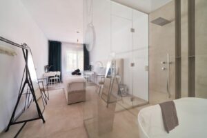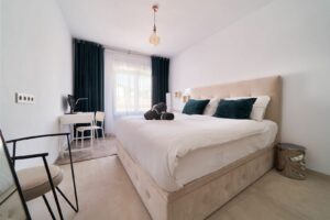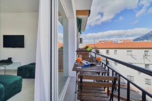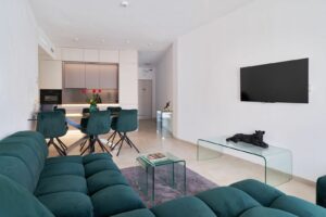 The apartment has a modern, fully equipped kitchen, a large master bedroom with en-suite bathroom, and a second bathroom with a jacuzzi and shower. The interior has been renovated in a modern style with high-quality materials.