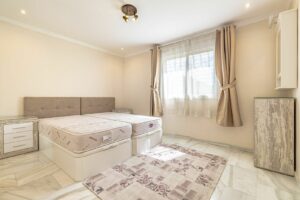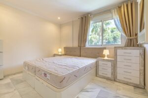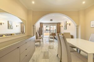 Impeccable corner apartment on the fifth floor with views of the pool and morning sun. The property has been completely renovated and is ready to move into. It has a living-dining room with access to the terrace, a fully equipped kitchen with a laundry room, a master bedroom with an en-suite bathroom and built-in wardrobes, and two further bedrooms, each with its own bathroom. Being on the corner, the property enjoys plenty of natural light. The car park is communal and enclosed with a gate. The building has a communal garden and swimming pool. Located in the heart of the city, just a stone's throw from Marbella's promenade and the beach.