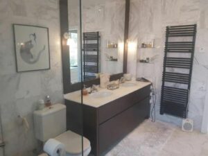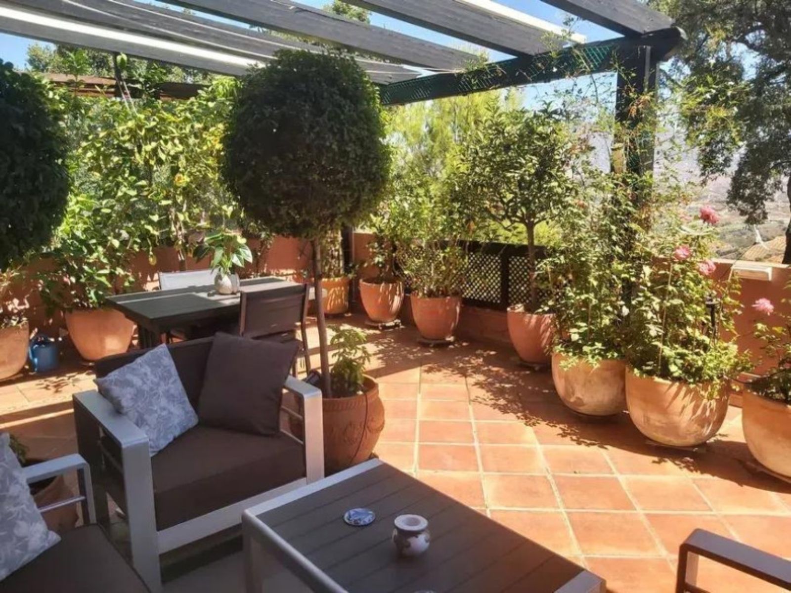 a highly sought-after area where no more construction is allowed: exceptional apartment with 3 spacious bedrooms, with east-west orientation and panoramic views of the sea and the hills of Mijas Costa. It is currently being connected to an internal solar plant. This beautiful apartment is located in the gated community , in a pure Andalusian style, with lush and flowery gardens. It offers a spacious, modern and very bright living space with numerous windows that open to nature and a fantastic sea view. The kitchen is open concept. It has 3 spacious bedrooms and 2 bathrooms, with a constructed area of approximately 200 m², including 2 terraces of approximately 45 and 10 m². This property includes a storage room and a private parking space. The urbanization consists of only 45 apartments with 2 swimming pools, the largest of which is an infinity pool with incredible panoramic views of the entire coast. The property is located just 7 minutes (6 km) by car from Elviria. This privileged location, very close to the famous German School, is very quiet and at the same time offers all services. There are several golf courses less than 20 minutes away by car, and Marbella is only 18 minutes away.