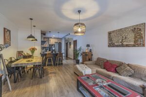 The renovated property features a total of three bedrooms, two bathrooms, a living room with an open kitchen, and a balcony.