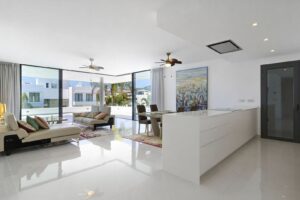 * Stylish minimalist architectural appearance with white ceramic tiles, white fitted wardrobes, white kitchen island and bathrooms