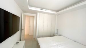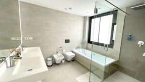 The master bedroom features an ensuite bathroom and direct access to the terrace, offering a serene space to wake up to the beauty of the sea. The additional two bedrooms are well-appointed and share a modern bathroom, ensuring comfort and convenience for family or guests.