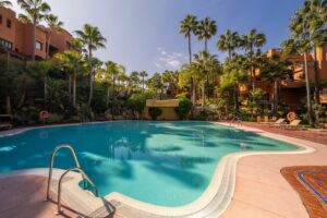 Residents have access to two communal swimming pools, beautifully maintained gardens, and a well-equipped gym. Ideally located, Surrounded by the best golf courses in the area. it’s just a 4-minute drive to the beach, the commercial center El Corte Inglés, local shops, beauty salons, and a variety of amenities.