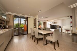 This exquisite home features a spacious living room seamlessly connected to a modern kitchen. Step out to the large terrace with a solarium and dining zone, perfect for entertaining or relaxing under the sun.