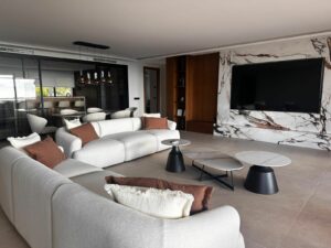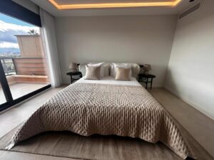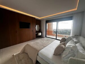 To the right of the living area, the luxurious master suite boasts a generously sized en-suite bathroom, a walk-in wardrobe, and access to a private terrace with sweeping panoramic sea views—an irresistible spot for morning coffee or sunset relaxation.