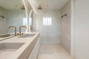 The three bedrooms feature custom-designed built-in wardrobes, and each bathroom has been designed with exquisite taste, using high-quality porcelain tiles, Italian-designed faucets, and integrated lighting details that enhance the interior architecture.