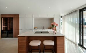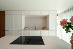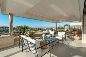The expansive 155m² terrace is thoughtfully designed with multiple zones, including an outdoor kitchen with lighting, double gas burners, and preparation for a fridge, as well as a chill-out area and plunge pool — perfect for entertaining or relaxing against the spectacular coastal backdrop.