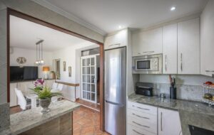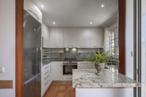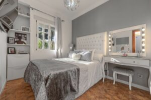 Then, a hallway separates the night area: three quiet, bright bedrooms; the main one, en-suite, ensures privacy. Afterwards, the second bathroom—refurbished with a walk-in shower and clean lines—serves the other two bedrooms. Moreover, ceramic floors make daily life easy and air conditioning in the day area guarantees comfort all year round; as an extra, security grilles on the exterior windows add peace of mind without giving up the light.