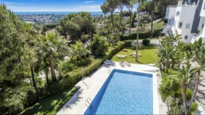 This beautiful corner apartment is nestled among pine trees, offering a truly tranquil setting while being very close to the heart of Nueva Andalucía just minutes from prestigious golf courses, Puerto Banús, and Marbella’s top restaurants and boutiques. From the moment you enter, the panoramic views of the Mediterranean Sea and La Concha mountain take center stage, creating an unmatched sense of home. A private path provides direct access to the property, and the fantastic outdoor sheltered spaces allow you to fully enjoy Costa del Sol’s weather all year round.