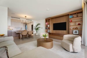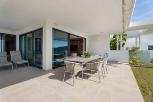The open-plan living and dining area connects directly to the covered terrace through floor-to-ceiling sliding doors, creating a fluid transition between interior and exterior spaces. The terrace functions as an outdoor lounge and dining area, overlooking the private garden and the Mediterranean horizon beyond. Integrated sound throughout the living room and terrace enhances the indoor–outdoor living experience, while the orientation captures natural light throughout the day and maintains comfort and shade.