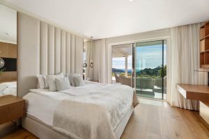 The primary suite features direct access to the terrace and private garden, allowing residents to wake to coastal views. It includes a well-appointed en-suite bathroom with premium materials and refined detailing. Two additional bedrooms share a modern bathroom, making the property ideal for family use or hosting guests. A separate guest toilet adds convenience and discretion.