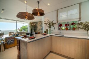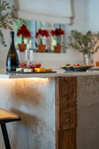The apartment offers three spacious bedrooms and 2 bathrooms, including a master suite with a walk-in wardrobe and direct access to the terrace, and a guest toilet. Finished in a warm and natural palette, the interiors combine textured walls, oak elements and stone details to create a refined yet welcoming atmosphere.