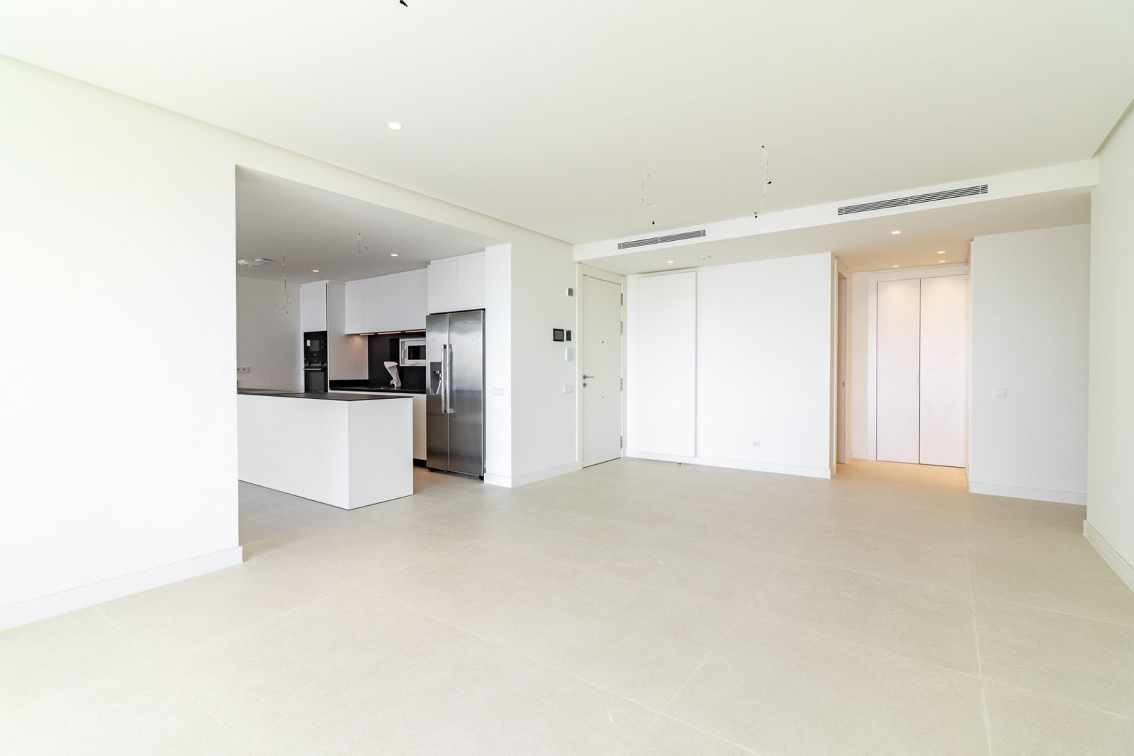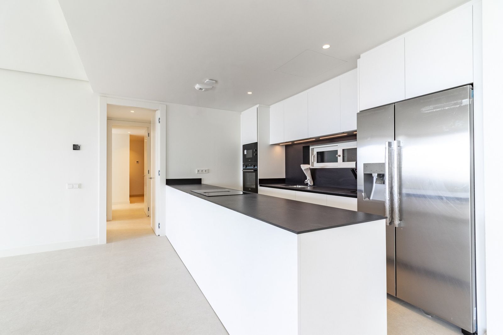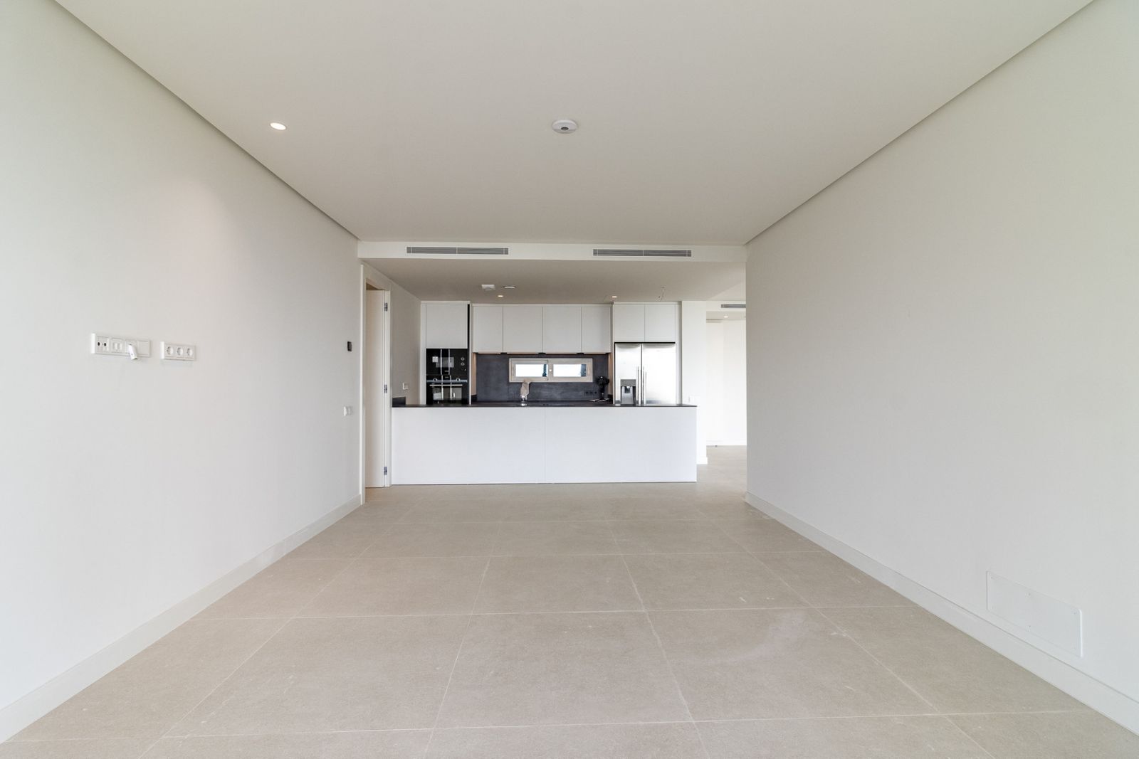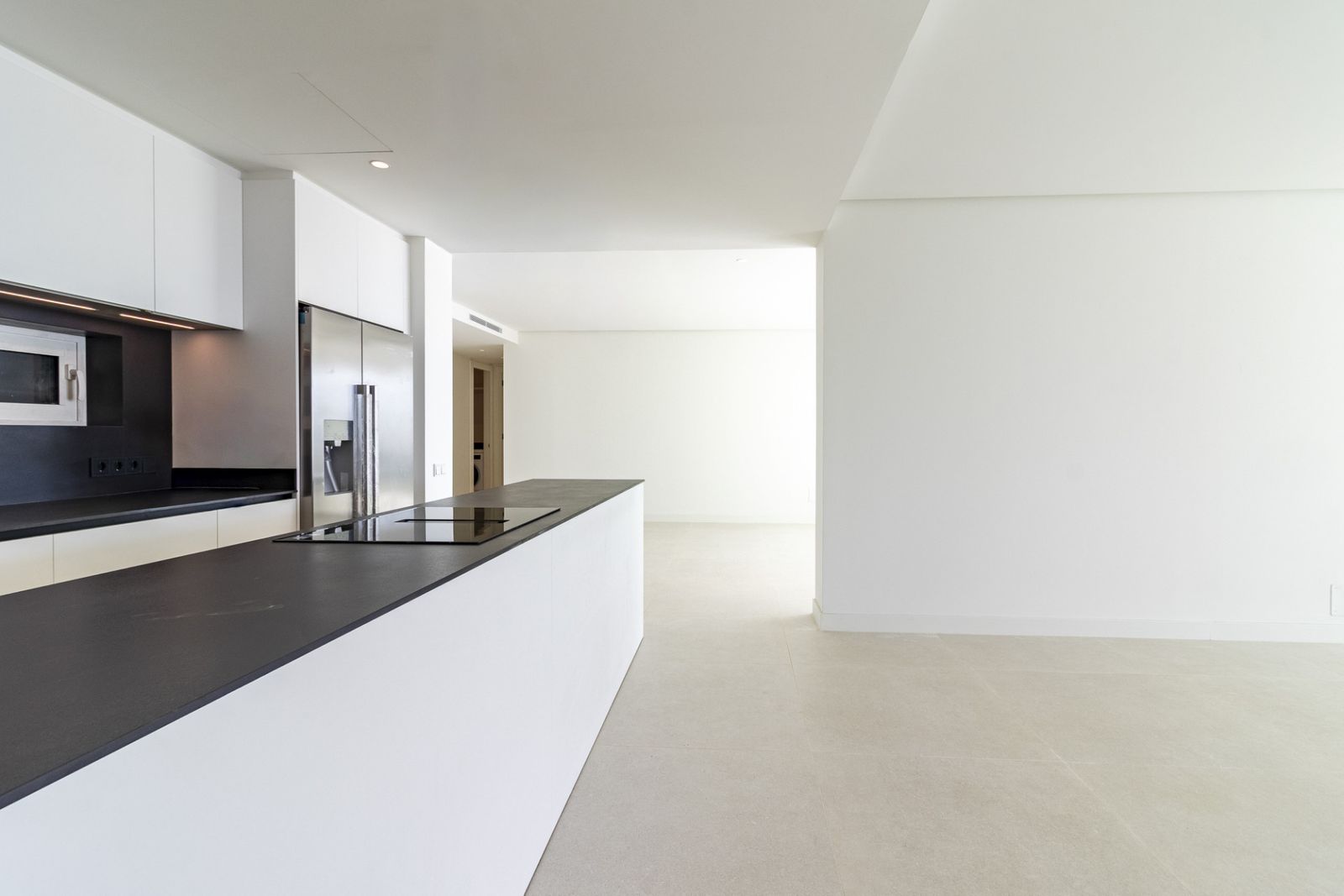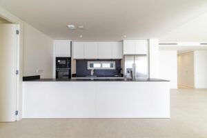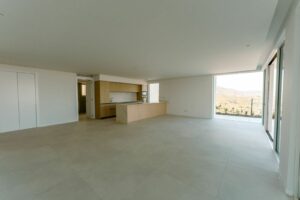 The spacious open-plan living and dining area seamlessly integrates with the modern, fully equipped kitchen, creating a bright and functional space that connects directly to the terrace. The design harmoniously blends indoor and outdoor spaces, offering an authentic Mediterranean experience.