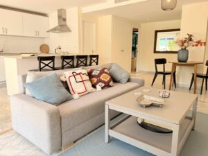 Upon entering the property, you are welcomed by a spacious and bright living-dining room that flows seamlessly into a modern, fully integrated kitchen. This open-concept design not only maximises the space but also creates the perfect setting for entertaining. From here, large windows open onto a fantastic west-facing terrace, the ideal spot for al fresco dining while enjoying Marbella’s unforgettable sunsets.