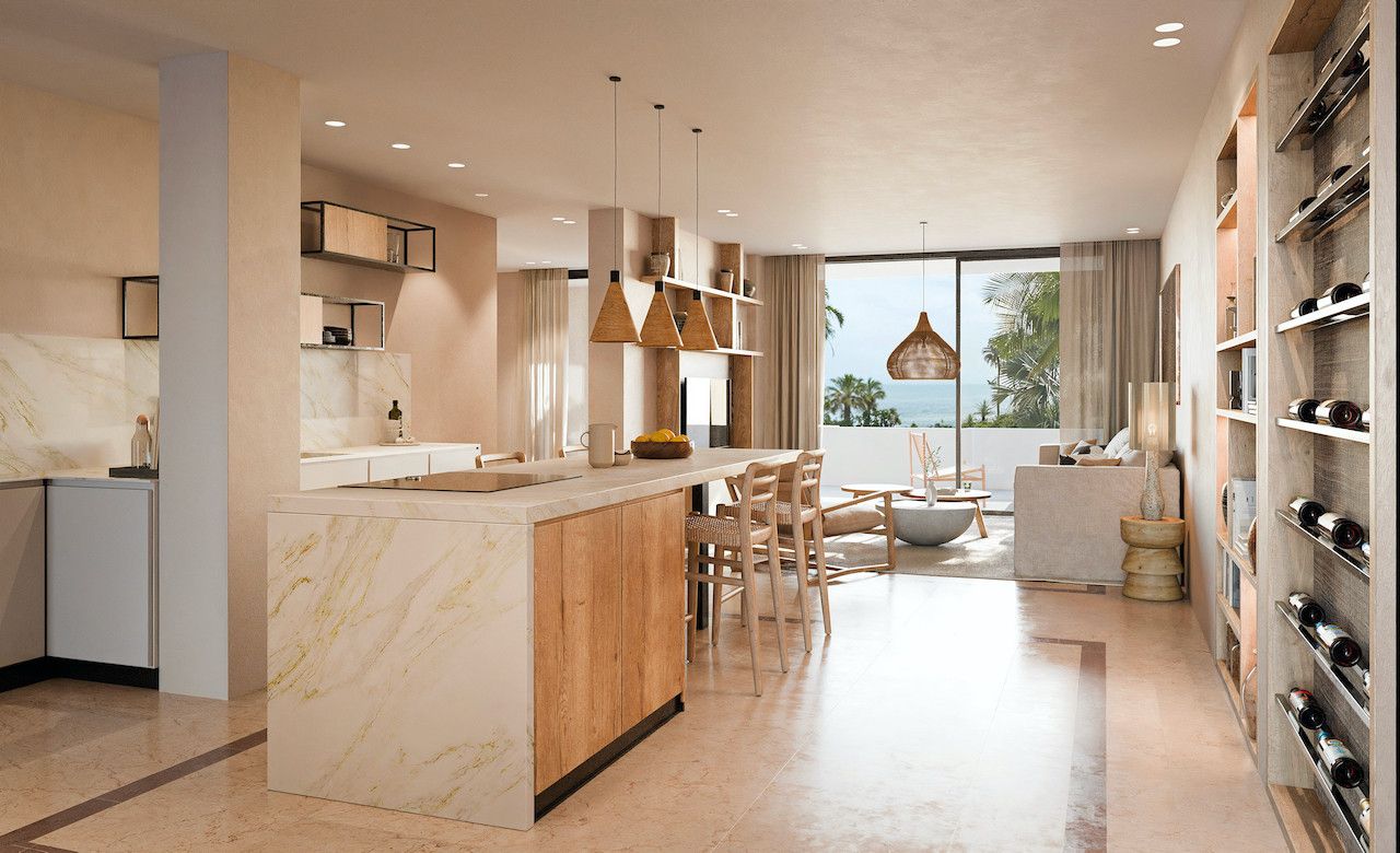 The spacious open-plan living and dining area is bathed in natural light and opens onto a southwest-facing terrace with spectacular sea views — ideal for enjoying Marbella’s sunsets. The brand-new kitchen, equipped with Siemens appliances, features a generous island with an integrated dining table, perfect for hosting family and friends.