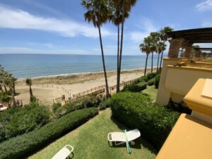 In the exclusive residential complex of Río Real Playa. One of the few apartments available in Marbella directly on the beach and ready to move into, spacious 3-bedroom house, spacious living-dining room open to the terrace with panoramic views over the Mediterranean, en-suite bathrooms with heated floors and service toilet, fully equipped kitchen with utility room. Río Real Playa has direct access to the beach, two outdoor swimming pools, one of them heated with 6-apartment buildings. The ideal setting to enjoy the sunset with the sea in the background with family or friends, next to the famous Trocadero Arena restaurant, a few minutes from the Río Real, Sta. Clara or Marbella Country Club golf courses. 5 min. from Marbella and its shopping centers, 35 min. From the airport. Alarm, garage and storage room. Enjoy the Mediterranean and life in Marbella.