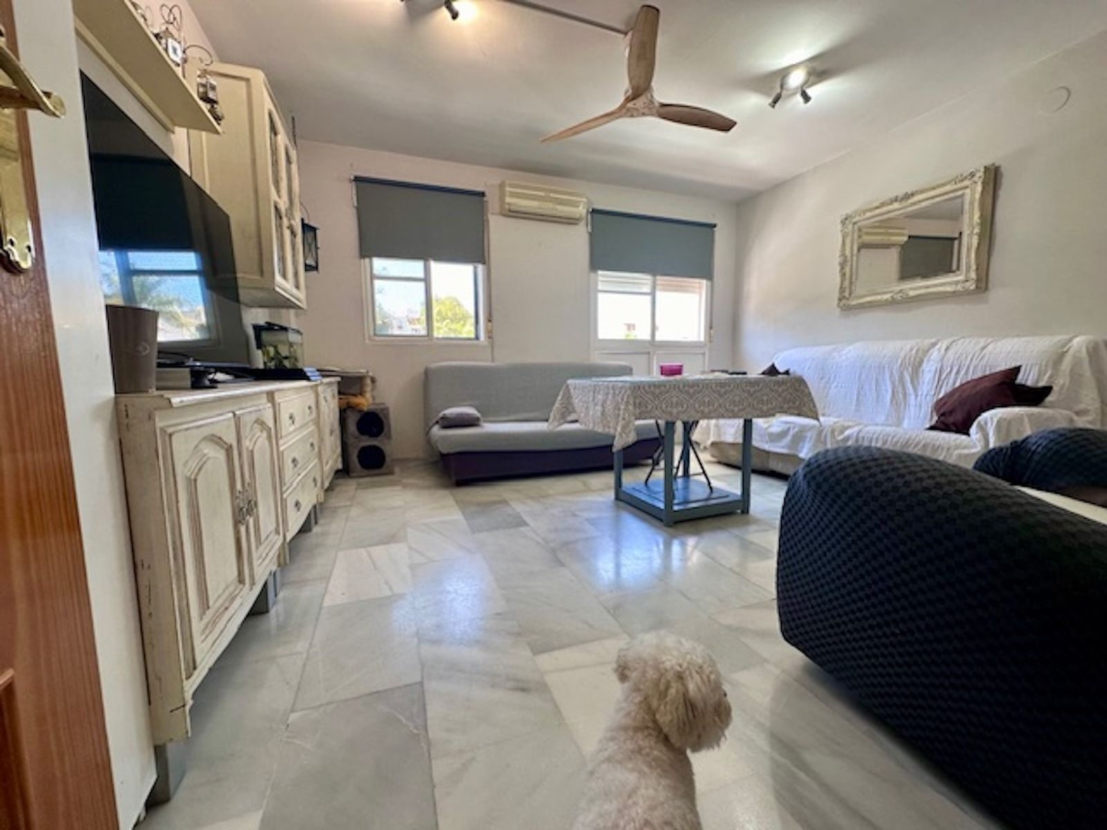 The living room faces the entrance hall, very bright, with two large windows (the apartment does not have a terrace), and the living room is quite spacious. (It has split air conditioning).