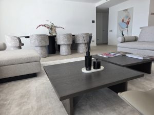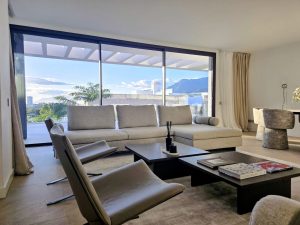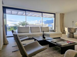 The living room is fully furnished with high-end designer furniture, creating a refined yet comfortable atmosphere with direct access to the terrace and private pool.