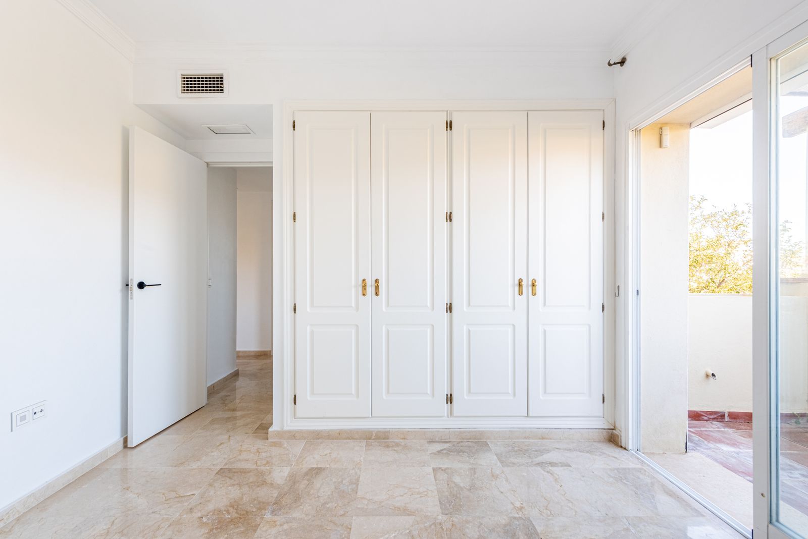 The property features a generous south-facing terrace with panoramic views over the pool area, the sea, and the surrounding landscape. The main terrace is directly accessible from both the living room through sliding doors and the master bedroom, creating a seamless indoor-outdoor living experience. In addition, there is a second terrace accessed from one of the other bedrooms.